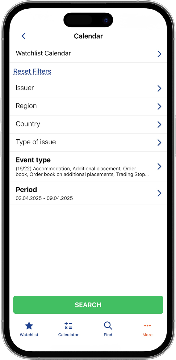 地域、発行体・発行種類、日付によるイベントフィルター